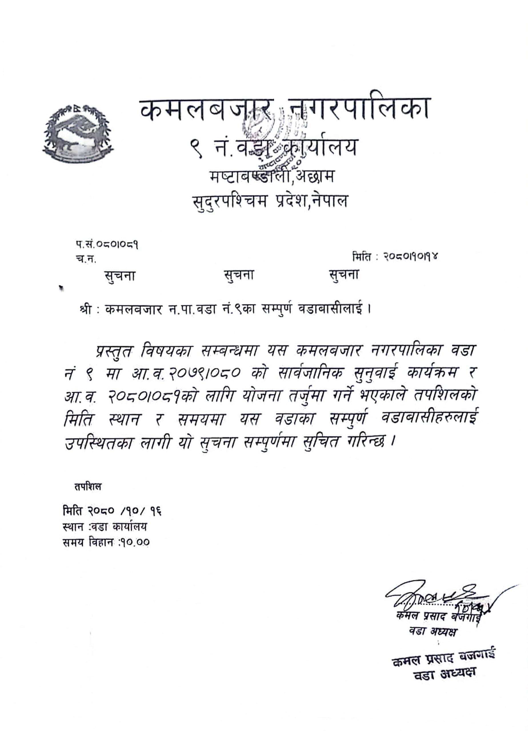 कमलबजार नगरपालिका कृषि विकास शाखा बाट प्रकाशित सूचना
