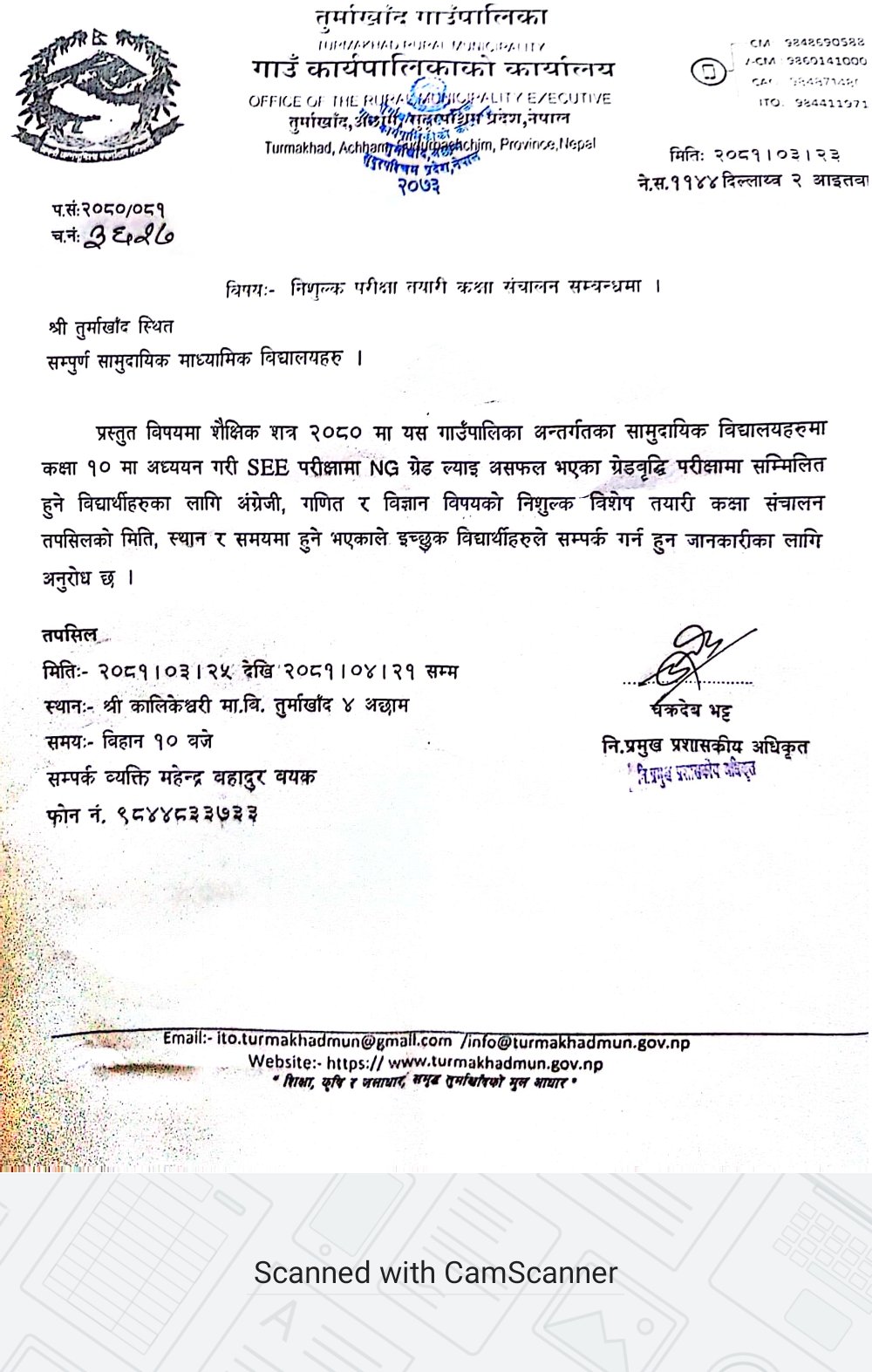 तुर्माखाँद गाँउपालिकाले एसइईको नतिजा सुधार्नका लागी निशुल्क परीक्षा तयारी कक्षा सञ्चालन गर्ने